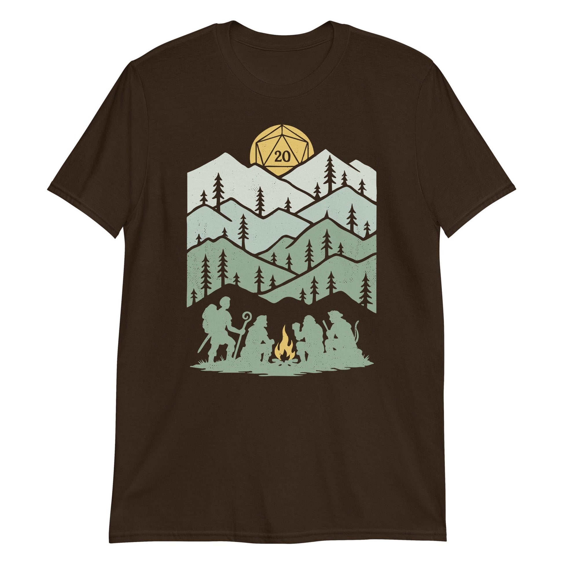 This epic D&D-themed graphic shirt features an adventuring party gathered around a campfire, resting after a long day of dungeon crawling — all set beneath a mystical forest landscape and rising d20 sun.