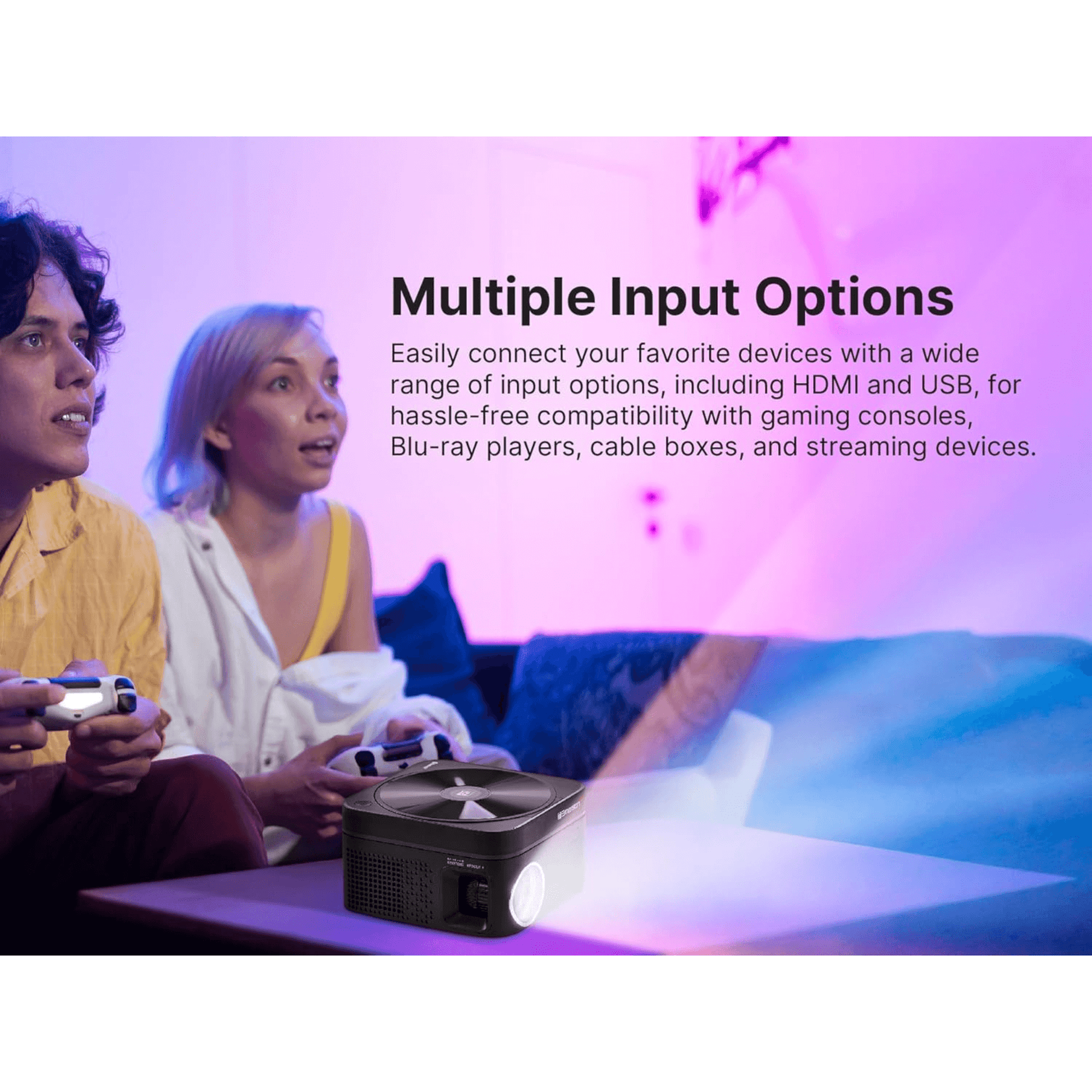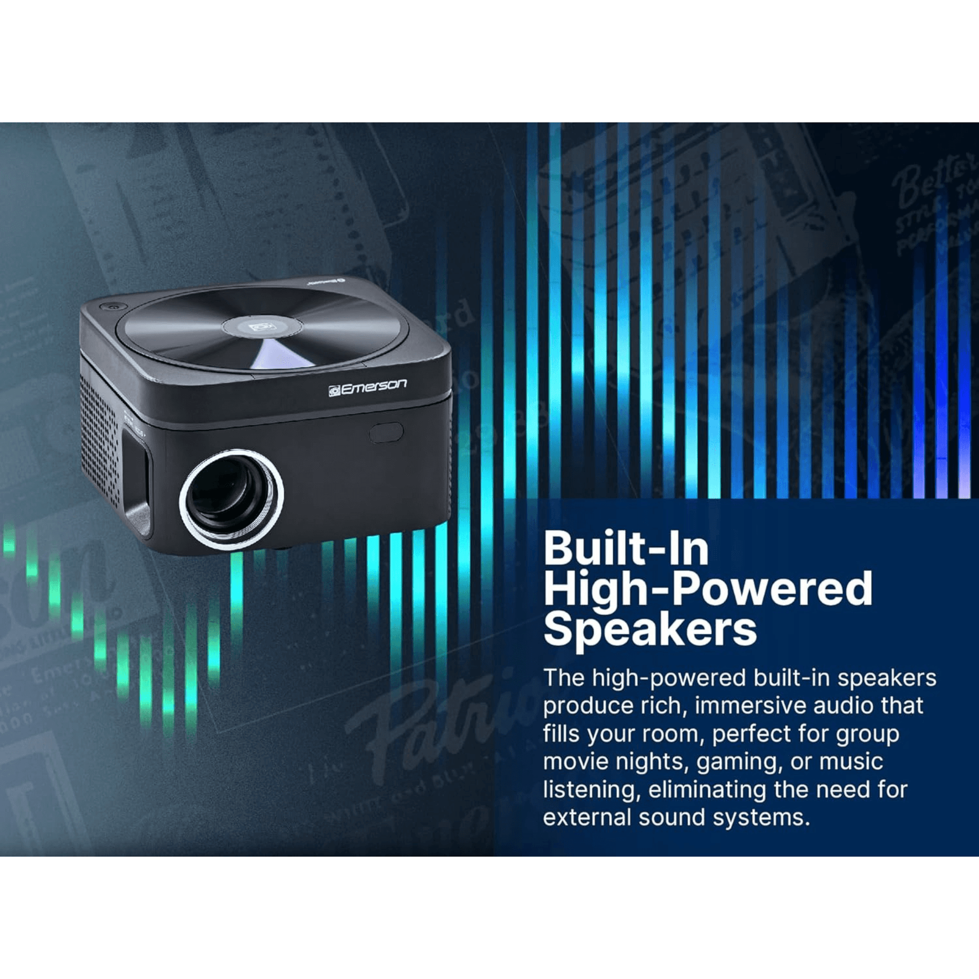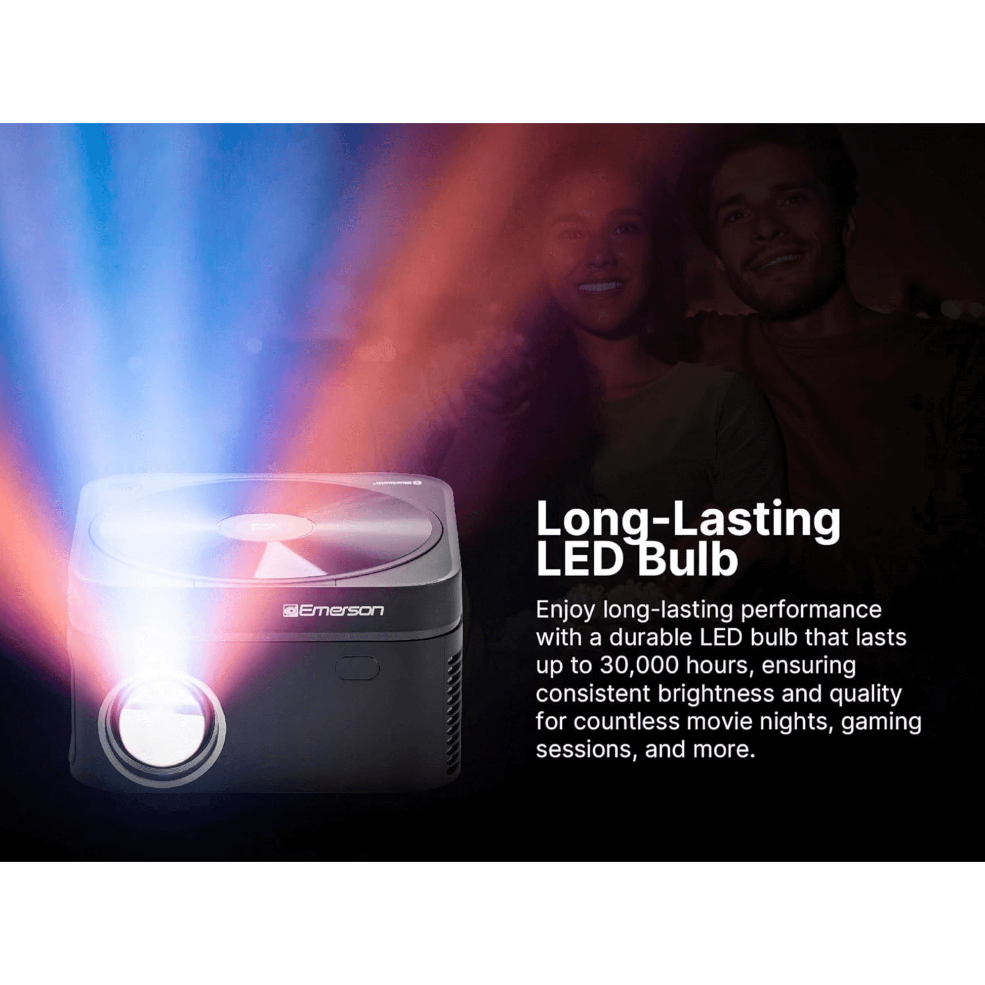 The Emerson Projector with DVD Player combines the power of an LCD projector with the convenience of multimedia playback in one sleek device. With a 720P native resolution and up to 100 Ansi Lumens brightness, enjoy crystal-clear images on large screens from 32" to 120". Stream media through a variety of sources, including USB flash drives, Micro SD cards, HDMI, or AV IN, or connect your favorite streaming devices such as Roku, Amazon Fire Stick, or Google Chrome Stick (devices sold separately). The built-in speakers provide great sound, while the 30,000-hour LED bulb ensures long-lasting performance. Control the projector from the comfort of your couch with the included remote control. Whether you're watching movies, playing games, or enjoying your favorite shows, this projector offers a versatile and immersive experience for all your entertainment needs.