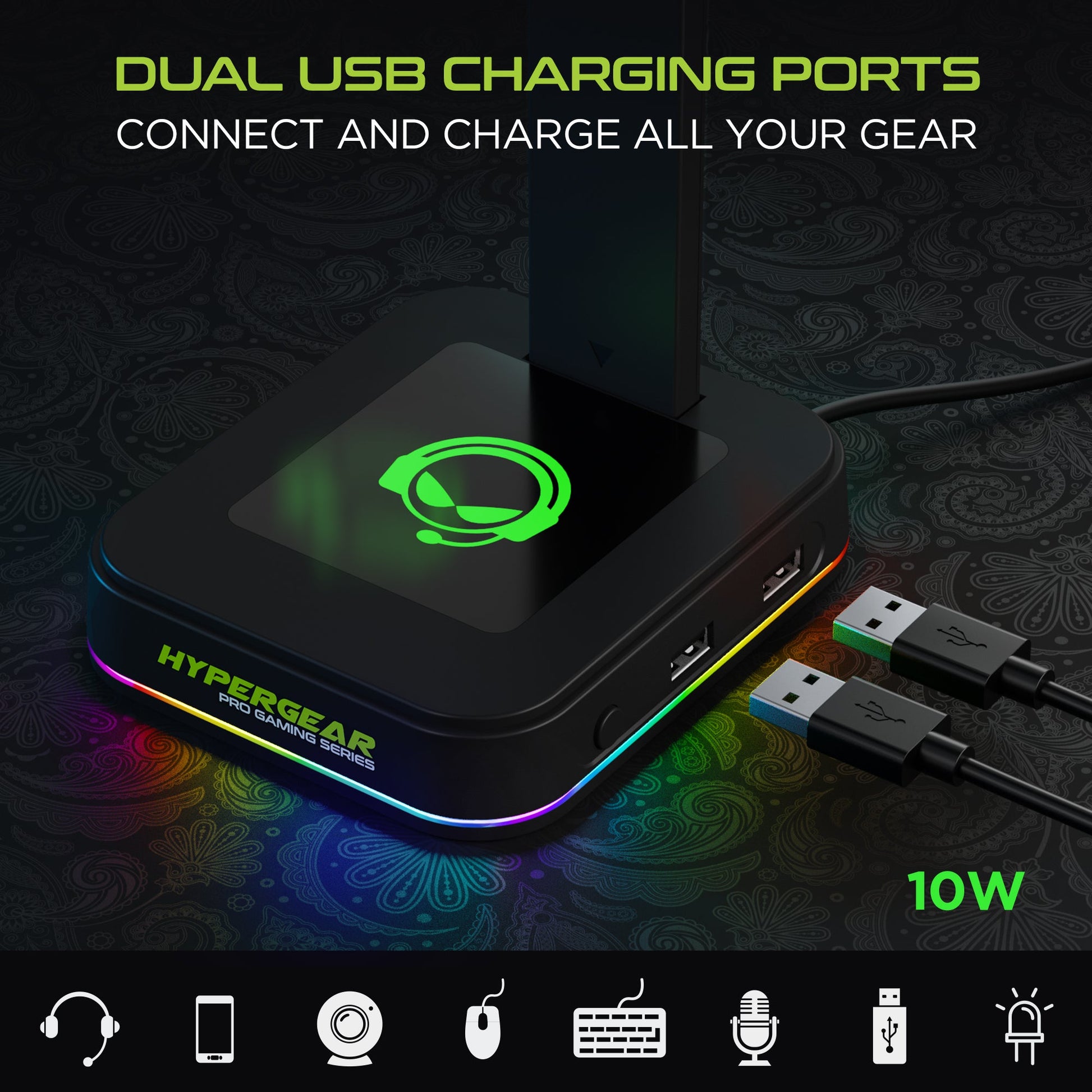 Get command of your battlefield with high-speed charging, expansive connectivity, and dynamic lighting. The RGB Command Station transforms your gaming setup into an organized battle station with a dual headset holder, 2 USB passthrough charging ports, and dynamic RGB lighting to completely control all your gear from one device. Keep all accessories on hand for when you need them, as the stand can hold two of even the largest headsets, so you can always have one ready at any moment. Dual USB charging ports allow you to charge and connect additional devices such as keyboards, mouses, or other accessories and sync or transfer data to add an edge to your gaming arsenal. Choose from 6 solid-color and a flashing RGB light effect to illuminate your setup. Gain the ground advantage with the RGB Command Station.