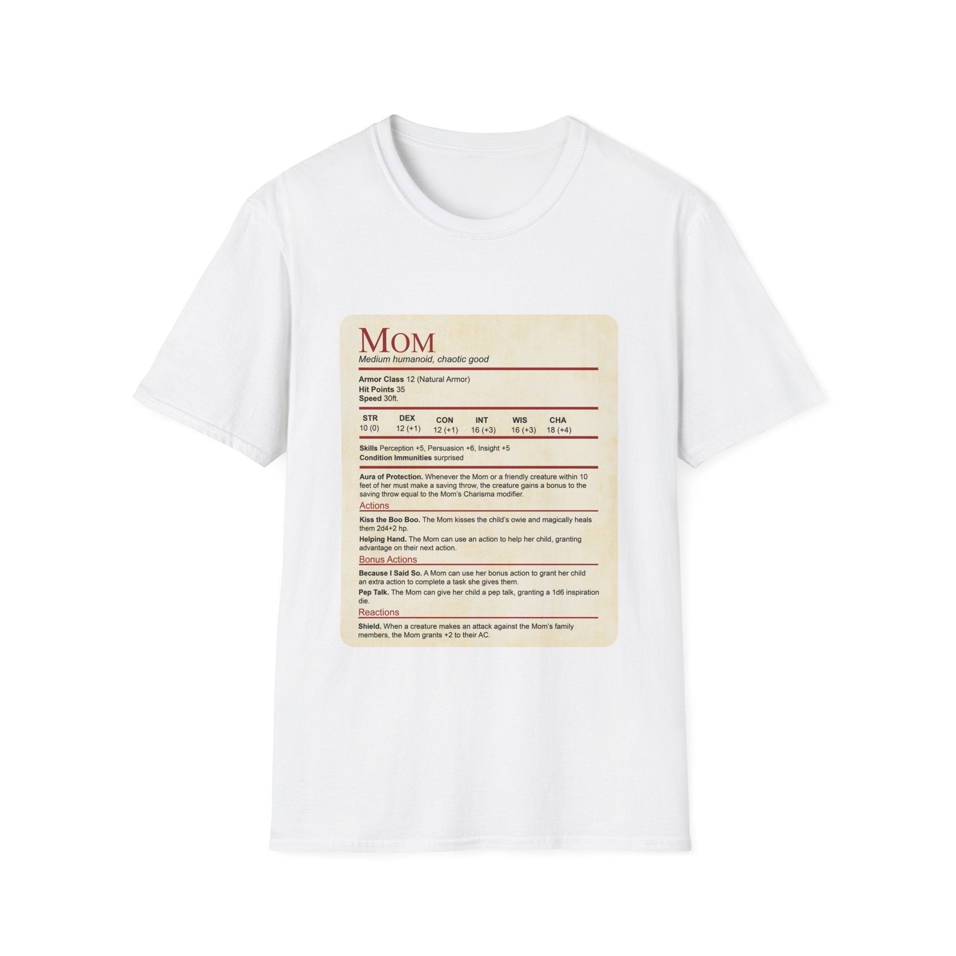 Mothers will love this mom dnd shirt designed for Dungeons & Dragons loving moms: the "Mom Stat Block" t-shirt! It makes for the perfect Mother's Day or birthday gift for the D&D loving mom in your life. So show your appreciation for all the hard work and love that moms put into their families with our fun and functional "Mom Stat Block" t-shirt!