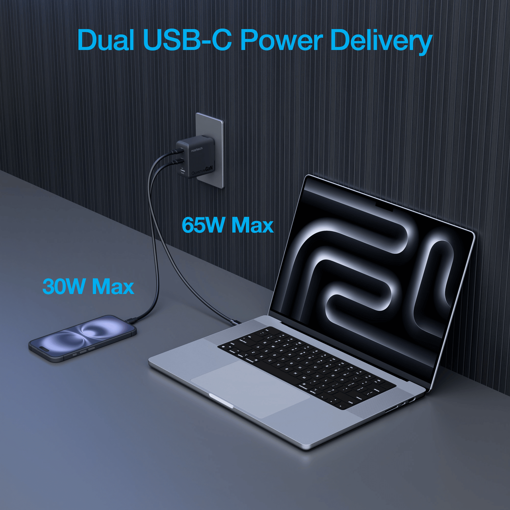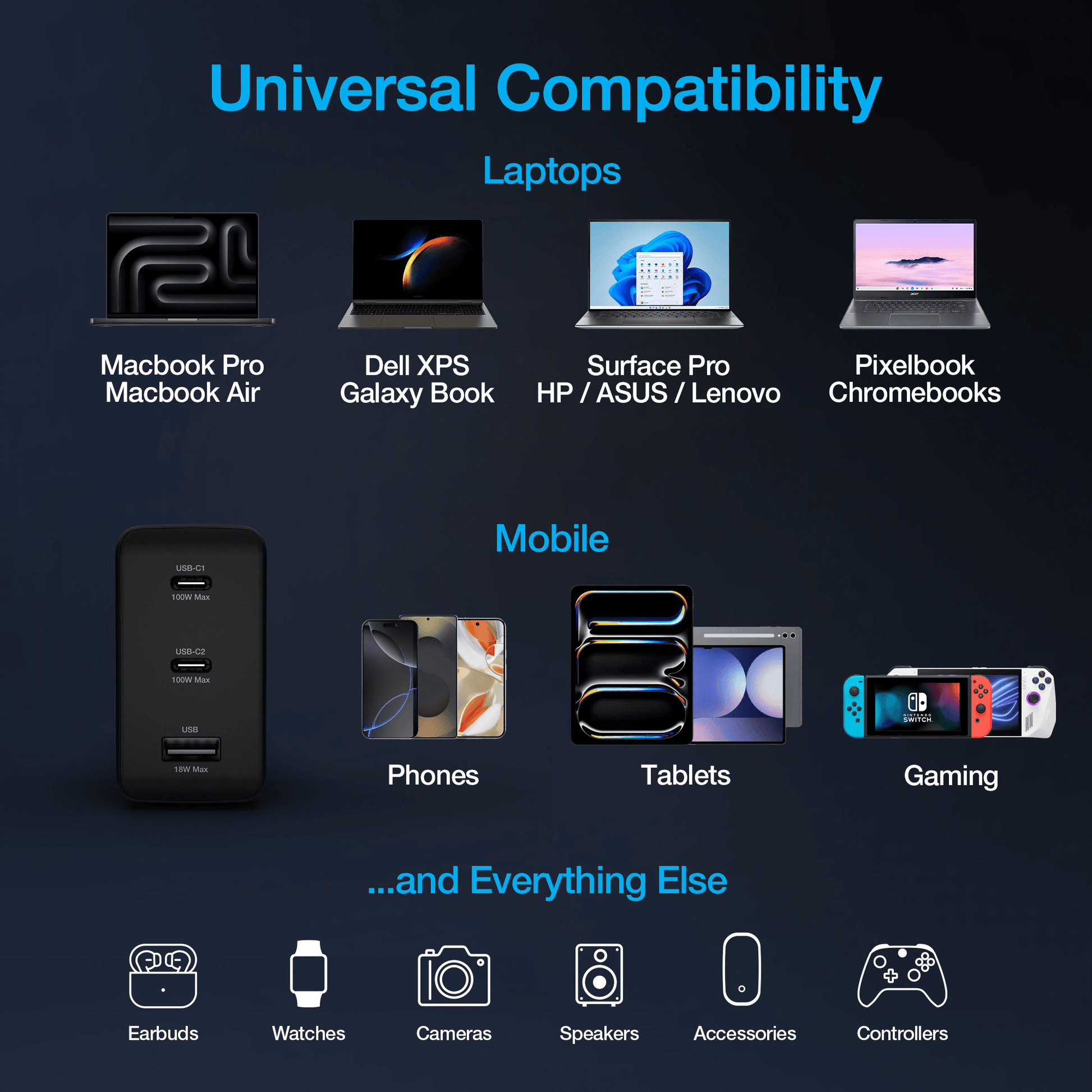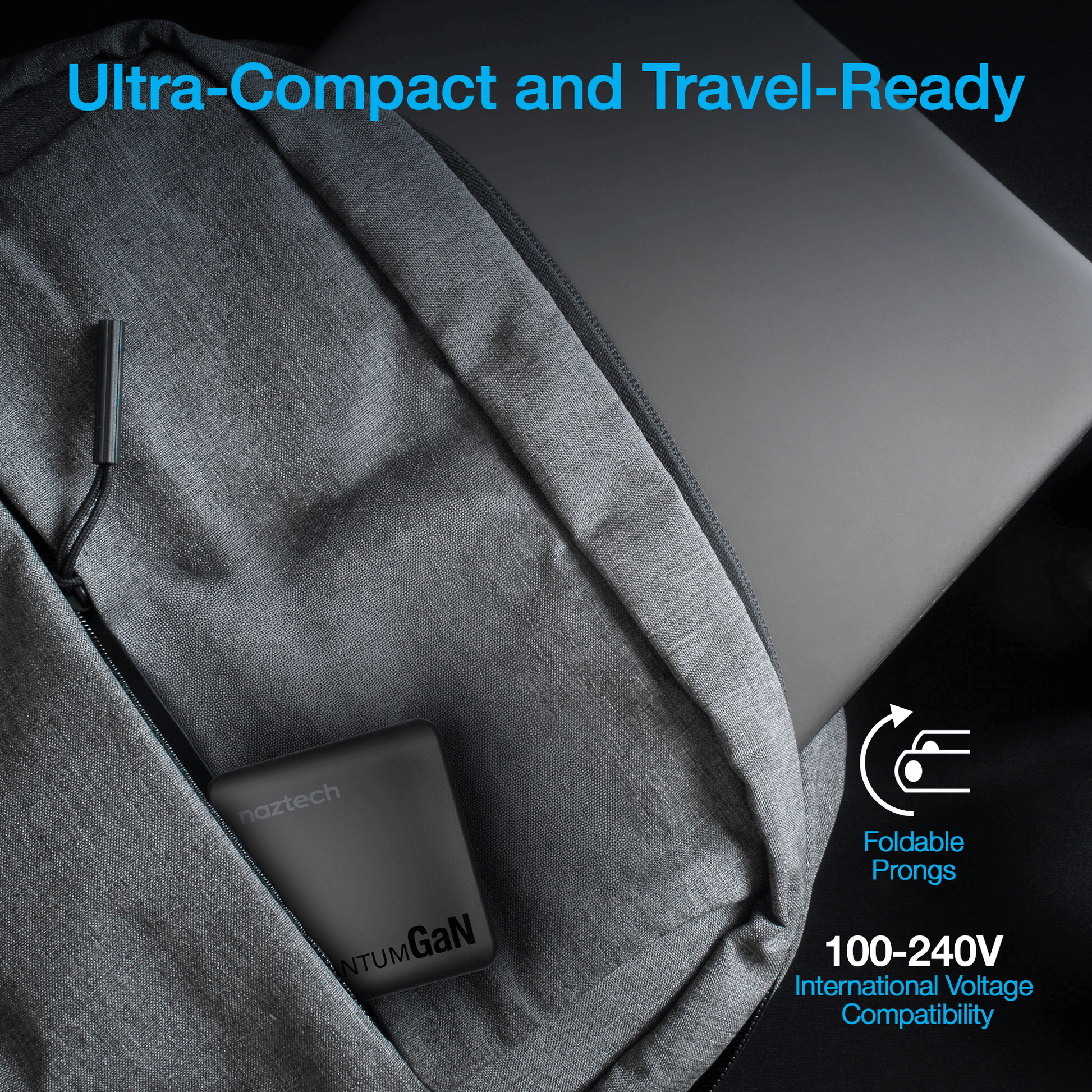 BIG POWER x SMALL SIZE. Introducing the Nexus Series - Naztech's fastest, smallest, and most efficient high-power chargers ever. Engineered with our cutting-edge Quantum GaN Technology, the ultra-fast Nexus T100 is equipped with dual USB-C PD ports and a USB port, so you can power up to 3 devices at the same time or charge a single device with up to 100W USB-C Power Delivery output - enough to fast charge a MacBook Pro from 0 to 50% in 27 minutes flat. This ultra-compact 3-in-1 charger is 35% smaller and lighter than an original 96W single-port charger, and it's universally compatible with everything from laptops, tablets, and phones to power banks, earbuds, and gaming devices.
