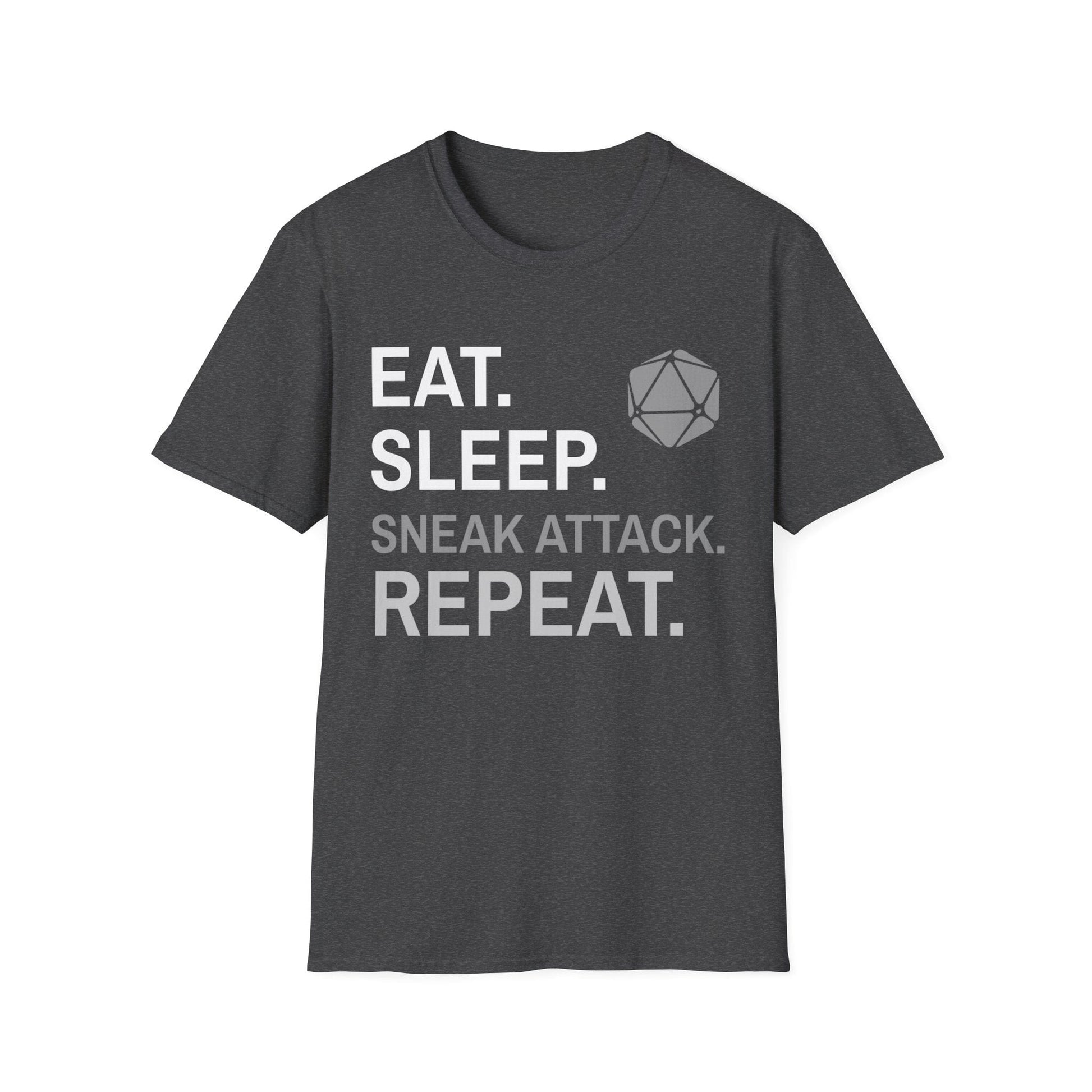 Master the art of stealth with our 'Eat, Sleep, Sneak Attack, Repeat' t-shirt! Crafted for the cunning rogues of Dungeons & Dragons, this tee is a must-have for anyone who thrives in the shadows and lives for the thrill of the unexpected strike.