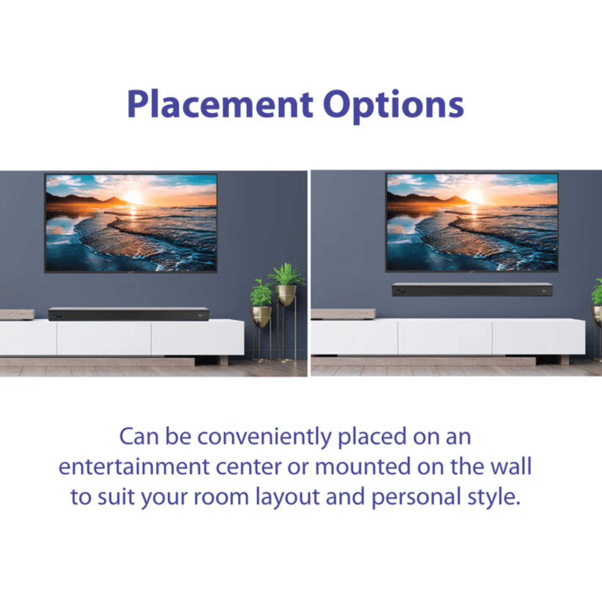 This Supersonic 2.0 channel Bluetooth soundbar delivers rich, immersive sound in a sleek 2.67" low-profile design that fits perfectly in front of your TV without blocking the screen. With Bluetooth 5.3 for up to 10M wireless range, it pairs effortlessly with your devices and also supports USB, AUX, Optical, and HDMI ARC inputs for versatile connectivity. Enjoy FM radio, HDMI, and Optical inputs for seamless TV integration, and choose from three pre-set EQ modes to optimize your audio experience. A vibrant LED screen shines through the speaker grill, while ambient lighting enhances your music or movies - and can be turned off when preferred. Complete with a remote control for easy operation, this soundbar combines style, convenience, and powerful performance.