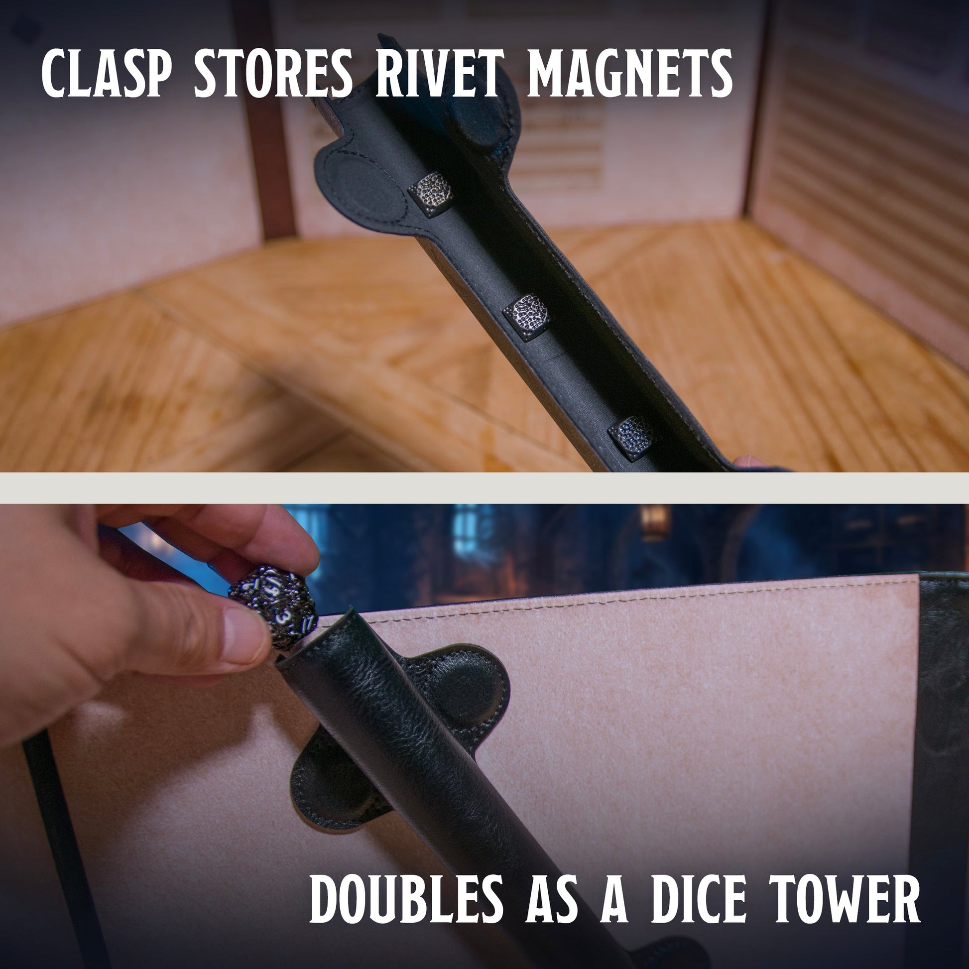 - A Magnetic clasp that stores 4 Rivet Magnets and doubles as a dice tower.